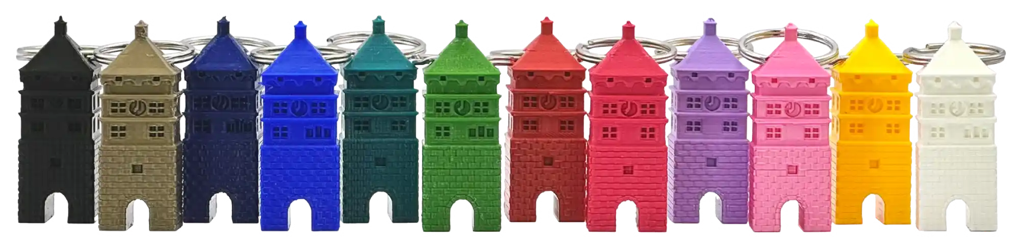 Detailgetreu 3D-gedruckt zeigt er die markanten Merkmale des historischen Stadttors. Erhältlich als praktischer Schlüsselanhänger oder als Magnet für Kühlschrank oder Pinnwand. Ein kleines Andenken an Freiburgs Altstadt.